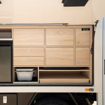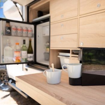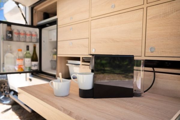 Der Wanderer „Luxe“ ist mit einer speziell entwickelten Outdoor-Campküche ausgestattet, die ein Induktionskochfeld, einen Kühl-/Gefrierschrank und eine Nespresso-Maschine umfasst. Damit wird die Zubereitung kulinarischer Highlights selbst an den entlegensten Orten in der australischen Wildnis zu einem wahren Genuss.